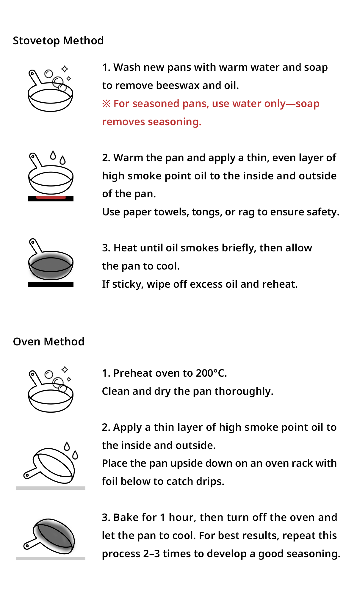 • Re-season if rust appears or if seasoning wears off.