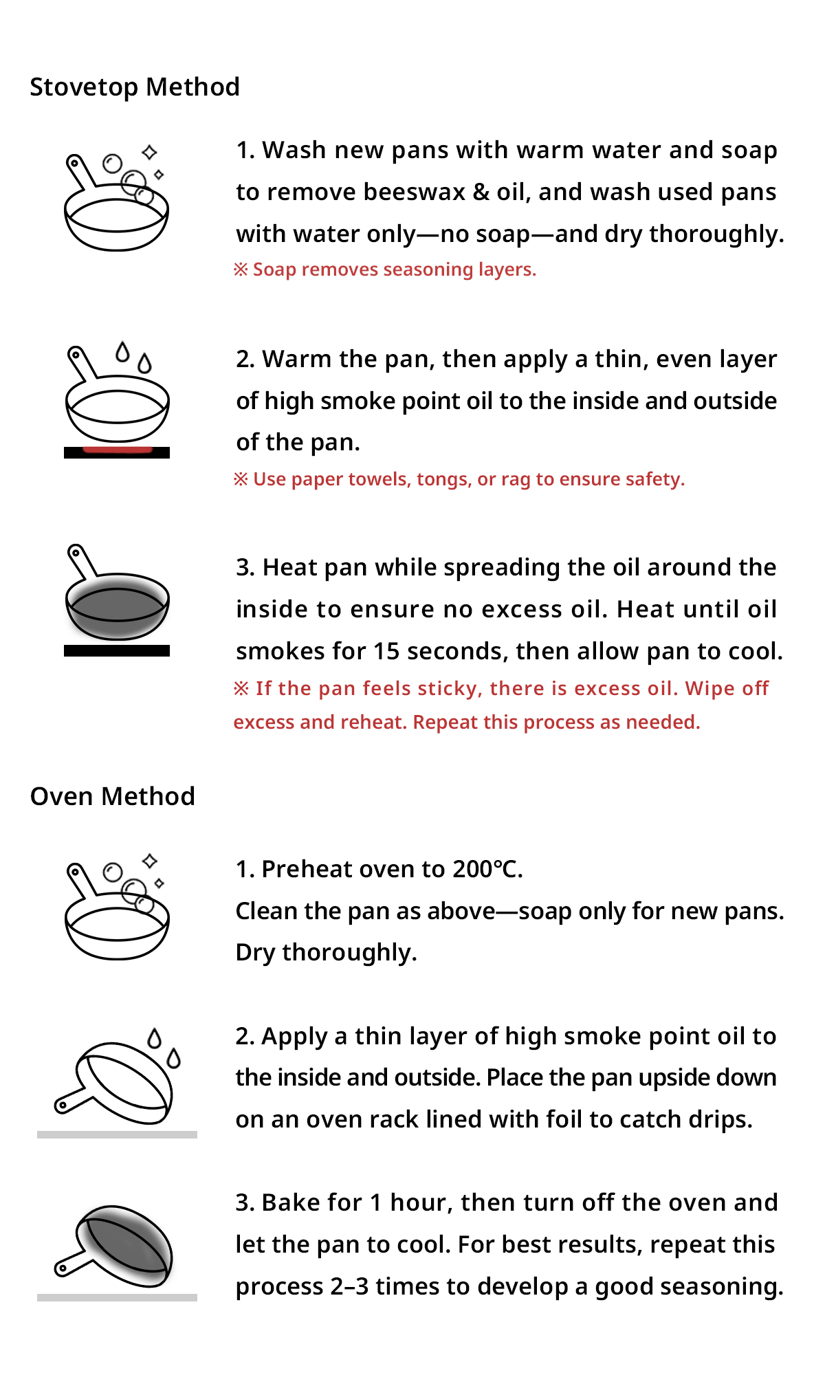 - Re-season if rust appears or if seasoning wears off.