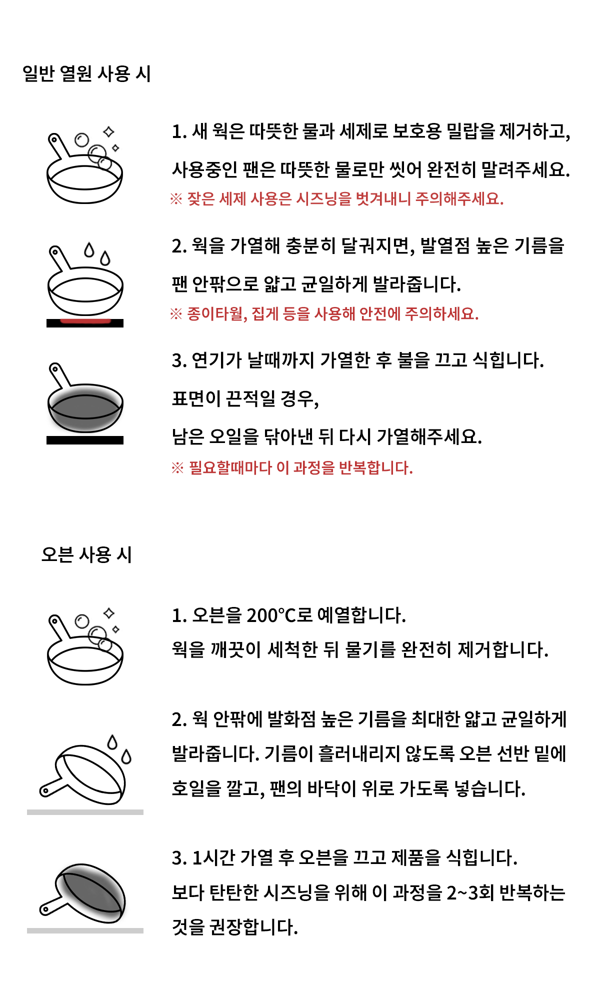 녹이 생기거나 시즈닝이 약해졌다면 다시 시즈닝해 주세요.
